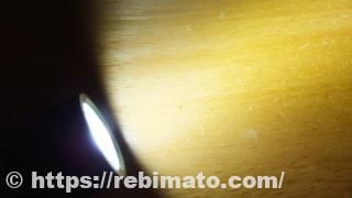 搭載されている白色LEDの仕様なのか、中心光は青みを帯びた色となっていますが、周辺光になるほど色が黄緑色になっています。上記の画像のようにコピー用紙など白い紙を壁にして光を見ると色の違いが判るかと思います。室内照明のようなきれいな白色をイメージしていたので残念だなと思いました。暖色モードでは色合いの変化はあまりないようです。