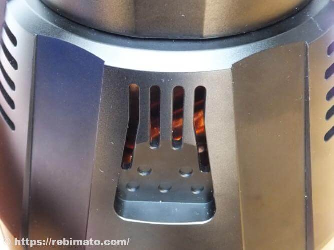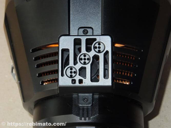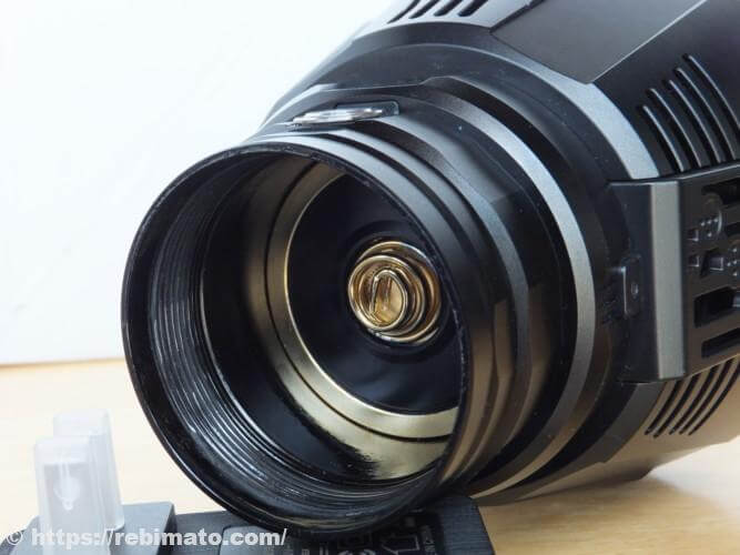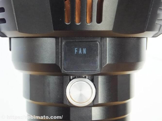 ヒートパイプも直径1cmくらいありそうです。放熱口から見えるヒートシンクから、このライトは金属製のボディに放熱を任せるのではなく、冷却用のファンとヒートシンクを駆使して放熱しているのがわかります。