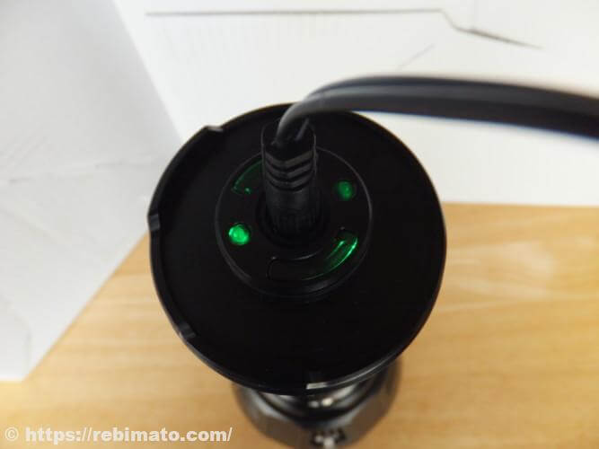 テール部のキャップを取り外すと。充電用のDCジャックが出てきます。DCジャックの周辺にはLEDインジケータが埋め込まれており、充電中は赤色に、充電完了時は緑色に点灯します。充電端子がPDに対応したUSB type-C端子だったら、専用の充電器を持ち運びせずに済んだかもしれないんだけどなぁと思いました。
