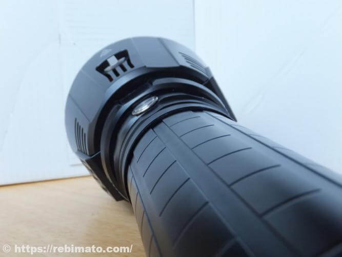 また、大抵の10000lmほどの爆光ライトでは、ヘッド部分に放熱用のフィン(表面積を増やすためのギザギザ)がついていますが、このMS18にはフィンではなく、放熱用のスリットが開いているのに目新しさを感じました。