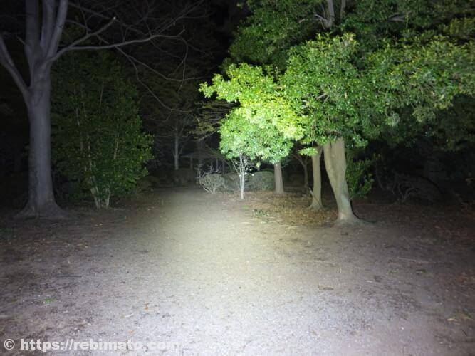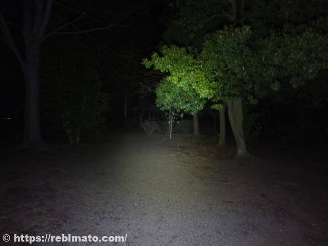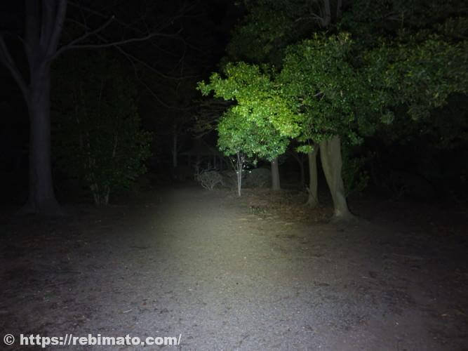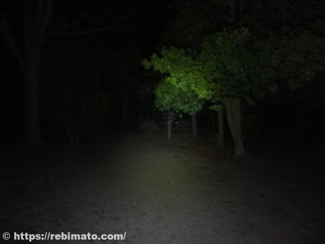 明るさでゴリ押すタイプのLEDライトですが、爆光に頼らずともある程度遠くまで照らせそうです。以下に掲載している照射画像で配光を確認していただければと思います。