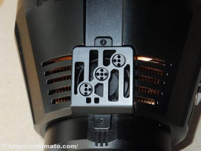 ヘッド側面からはLED放熱用の冷却ファンと銅製ヒートシンク、さらにヒートパイプが見えます。目視できる部分から考えると、ヒートシンクは6cm × 7~8cmで、高さ4cmくらいのサイズがあるように見えます。