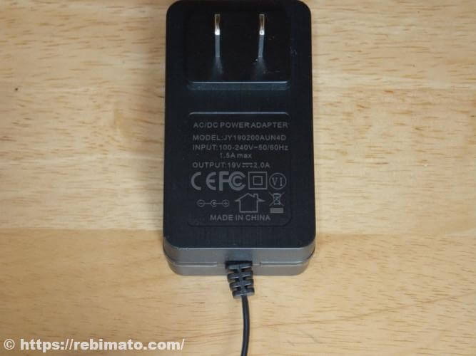 ACアダプターは出力が19V2Aのものです。出力端子は普通のDCプラグであったため、19Vの汎用ACアダプターでプラグのサイズが合えば代替品として使えそうです。