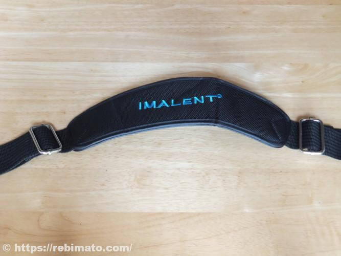 ショルダーベルトはIMALENTロゴ付きでほつれなどもないしっかりしたものです。本体ヘッドとテール部のストラップホールにつなげることで肩掛けで使用できます。