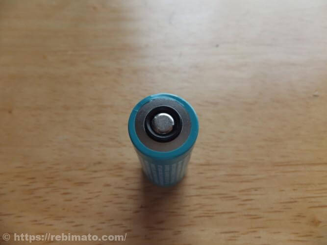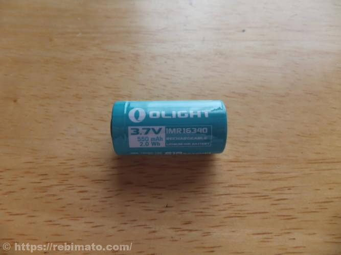 バッテリーはOlight製LEDライト専用のものです。バッテリーの種類はIMR16340で、+側端子は黒い絶縁体によって端子が仕切られています。容量は550mAhと、小型なバッテリーであるがゆえに、LEDライトでよく使われる18650バッテリーなどと比べると容量は少ないです。