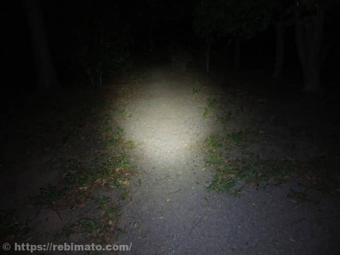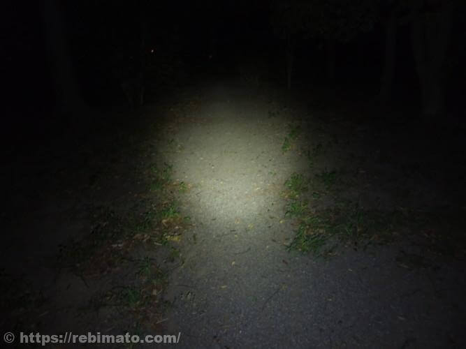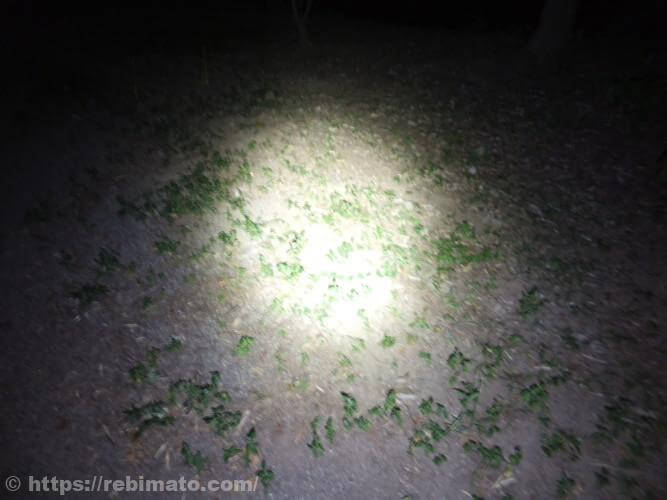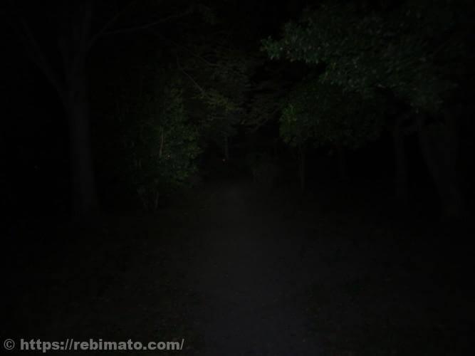 LowモードやMidモードでは、奥にある木が照らされているのかどうかは肉眼でもわからないほど暗い状態でした。さすがにルーメン値が2桁の明るさでは遠くを照らすのは厳しいですね。